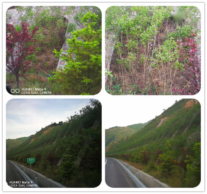 太行山上框格梁植生袋綠化8年后效果!袋子雖然都爛了,但是灌木長的非常好!做邊坡綠化,好的客土噴播施工工藝和選擇合適的灌木草種就能得到很好的綠化效果。