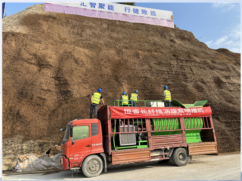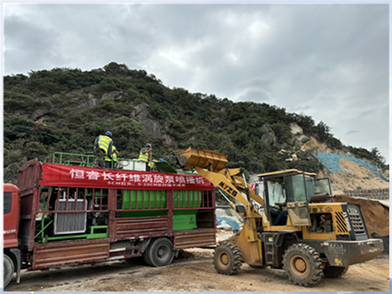 在項目實施過程中,恒睿長纖維渦旋泵噴播機的技術優勢全程凸顯:其獨特的噴播設計,能將混合了種子、纖維苔蘚和有機菌肥的生態材料,輸送至混凝土坡面的每一處,確保材料掛壁牢固、分布均勻,從根源上解決了 “植被扎根難” 的問題。同時,景繡生態聯合恒睿機械建立 “問題即時解決” 機制,針對施工中遇到的坡面坡度差異、材料配比調整等問題,依托恒睿長纖維渦旋泵噴播機的靈活操作性能,結合纖維骨架團粒結構技術,動態優化施工方案 —— 先鋪纖維骨架調節基質層吸水性,再通過噴播機分層構建生態防護層,讓坡面生態修復既效率高又效果好。